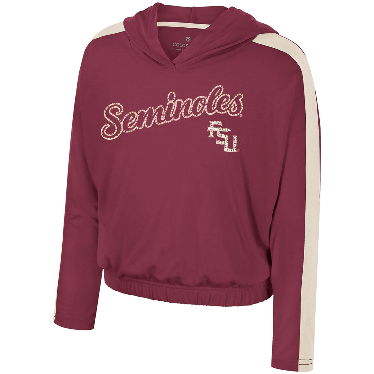 Colosseum Youth Girl's Seminoles/Stacked FSU Rhinestone Design Long Sleeve Hooded T-shirt - Garnet - Garnet/Gold / YXS is backordered and will ship as soon as it is back in stock.