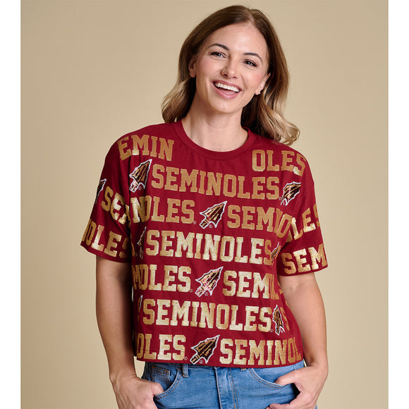 Stewart Simmons Women's Seminoles/Arrowhead Design Sequin Short Sleeve T-shirt - Garnet