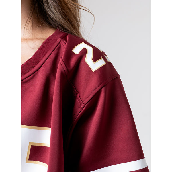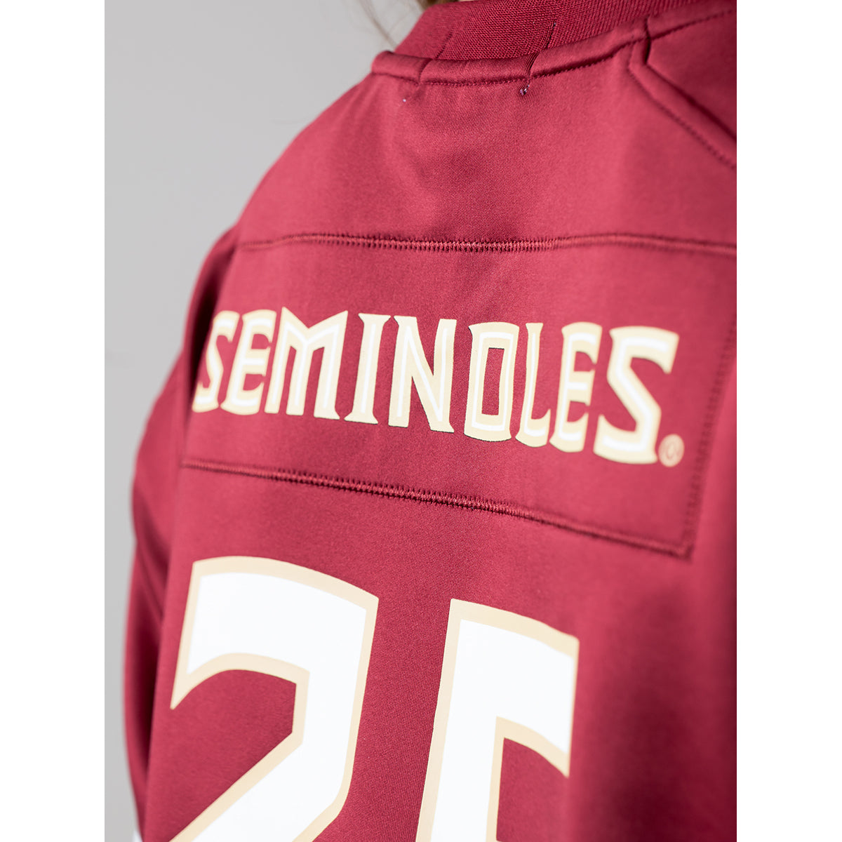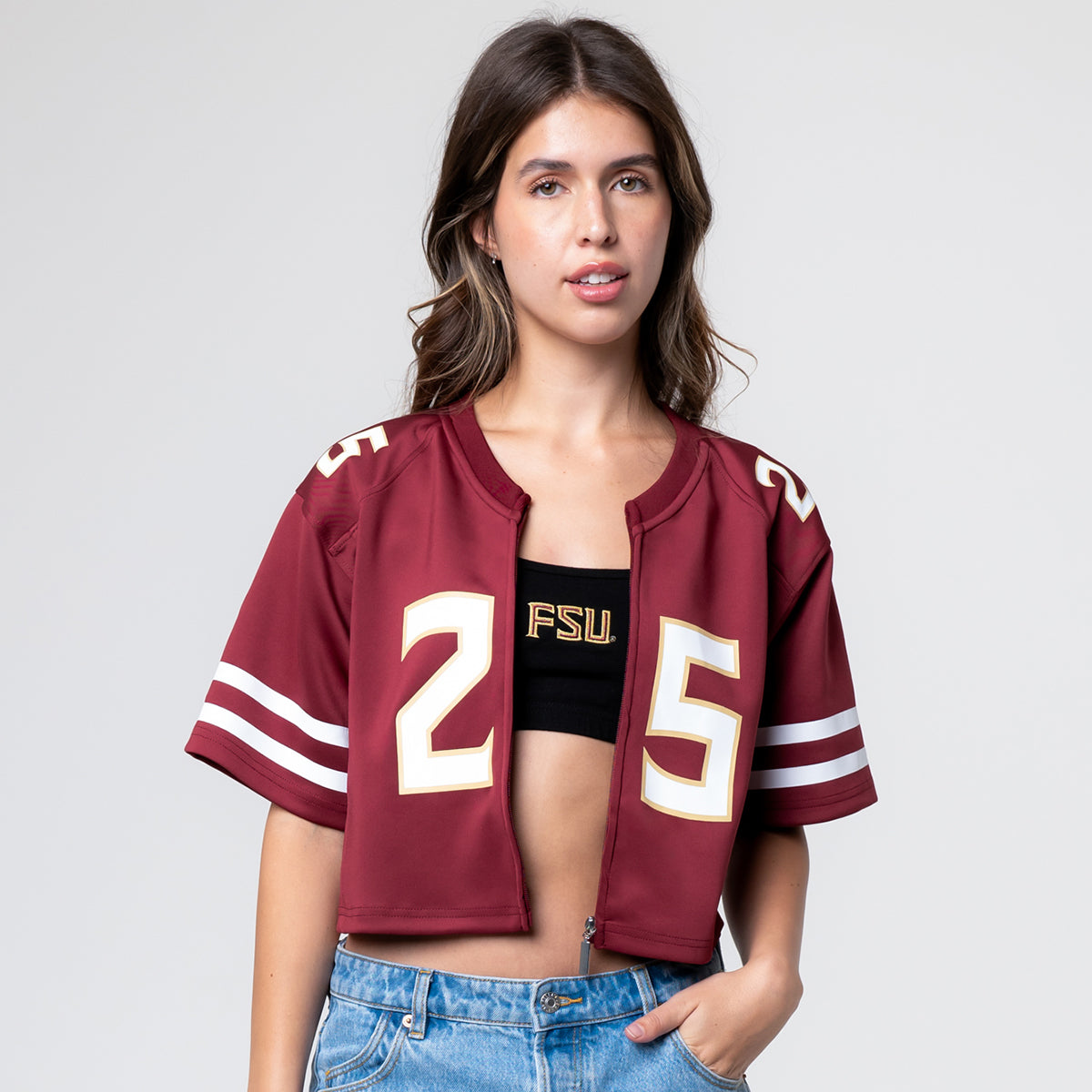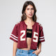 Material | 100% Polyester. Color | Garnet. Women's crop zip jersey with screen printed #25 on front, sleeves and back. Screen printed Seminoles on back.