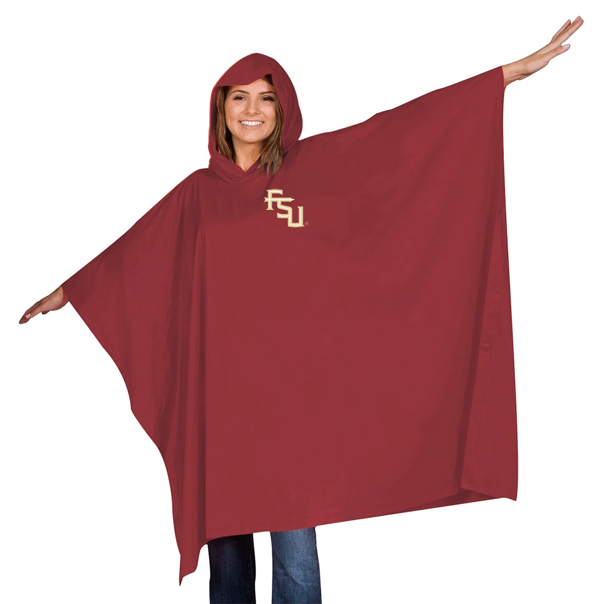Material | 100% Waterproof PVC. Color | Garnet. Medium weight poncho with screen printed Stacked FSU. 52x86. One size fits most. Snap closure at sides.