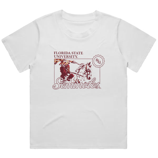 Material | 100% Cotton. Color | White. Women's short sleeve oversized t-shirt with screen printed Florida State University Seminoles Osceola/Renegade design.