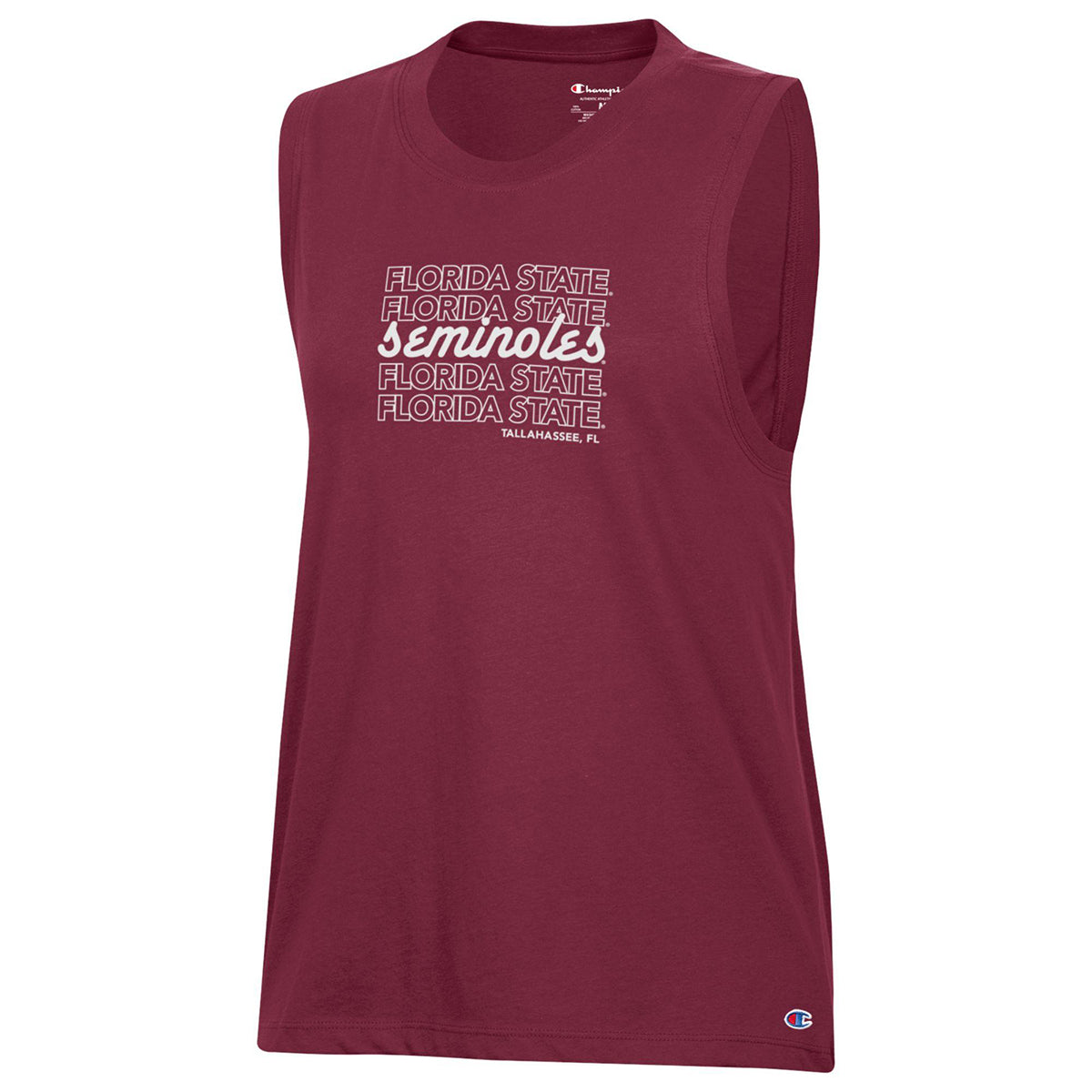 Material | 60% Cotton, 40% Polyester. Color | Garnet. Champion women's muscle tank with screen printed Florida State Seminoles design.