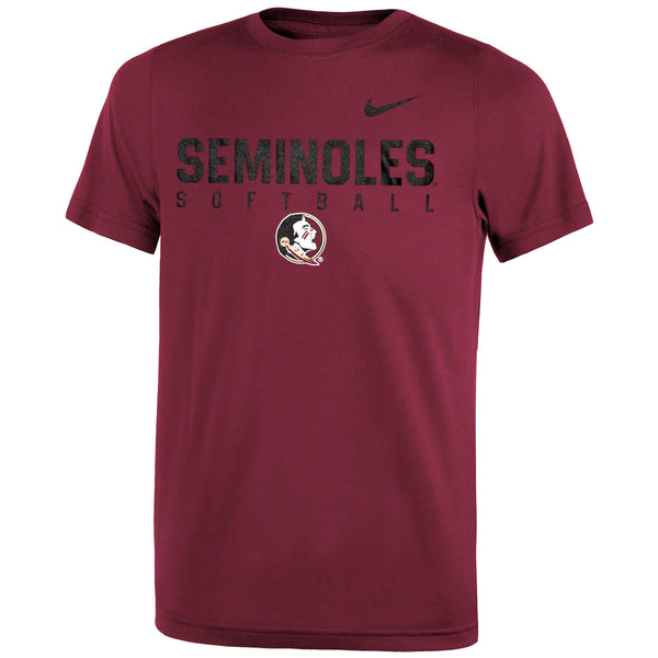 Material | 100% Polyester. Color | Garnet. Nike youth short sleeve performance t-shirt with screen printed Seminoles Softball Seminole Head design.