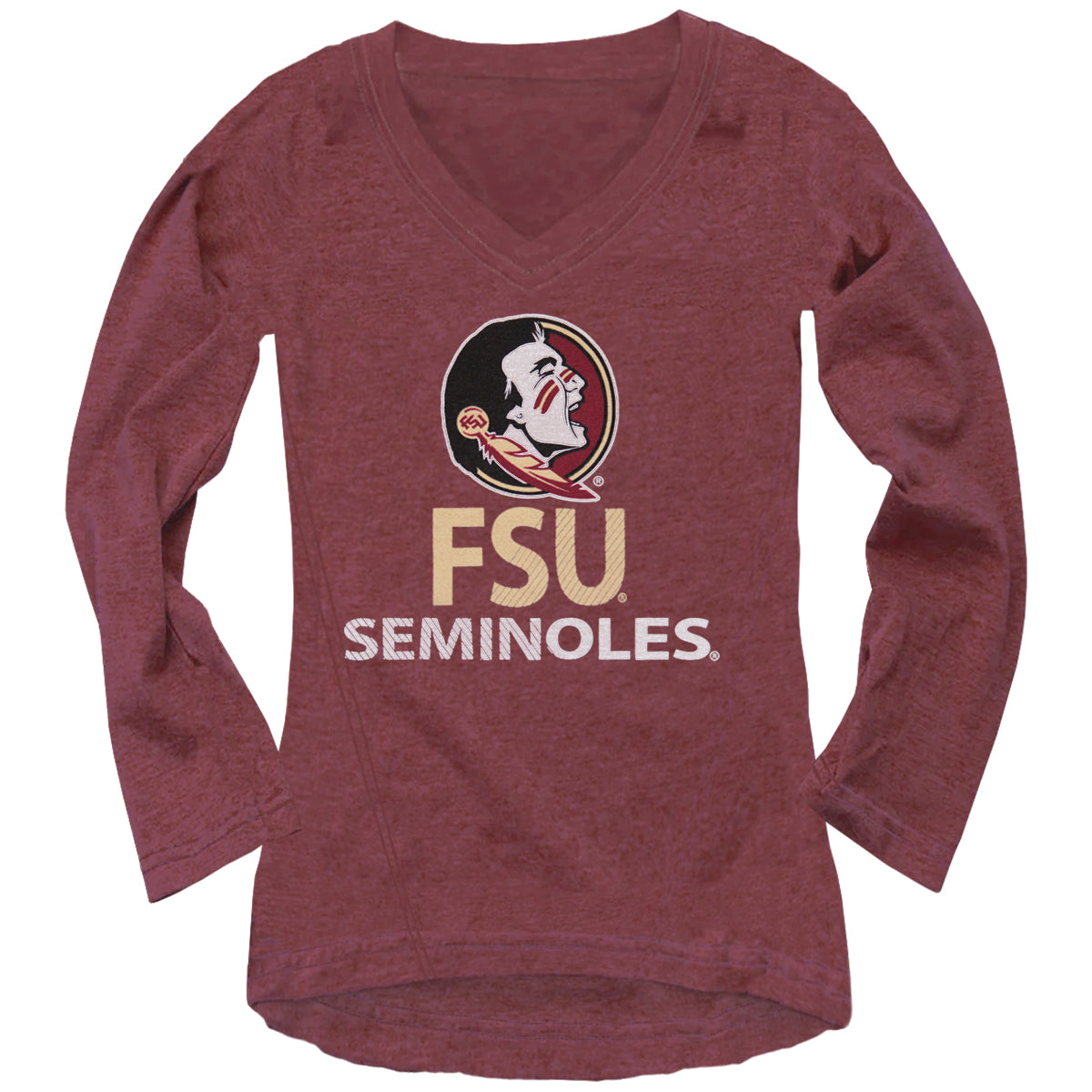 Material | 60% Cotton, 40% Polyester. Color | Garnet. Girl's long sleeve slub t-shirt with screen printed Seminole Head FSU Seminoles design.