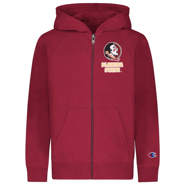 Material | 60% Cotton, 40% Polyester. Color | Garnet. Champion toddler full-zip hood fleece with screen printed Seminole Head Florida State. Pocket.