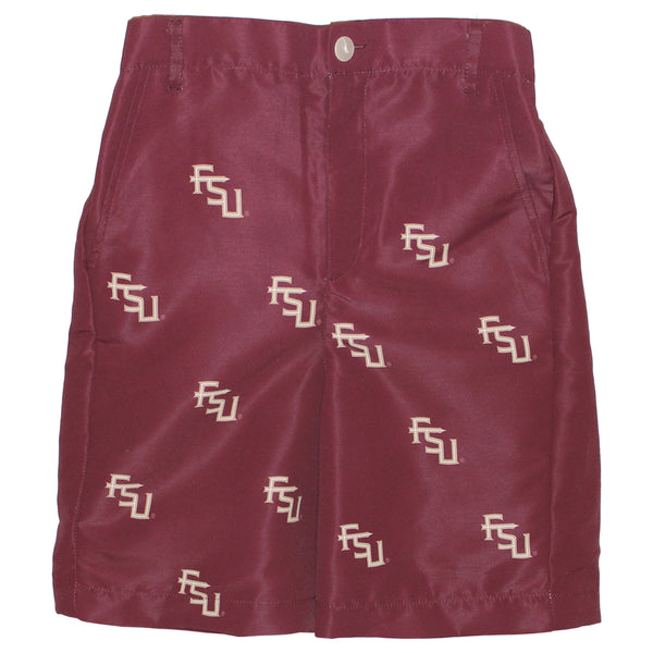 Material | 100% Polyester. Color | Garnet. Toddler/Youth boys sublimated shorts with all over Stacked FSU. Pockets