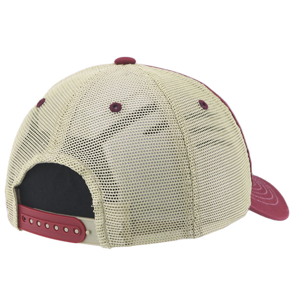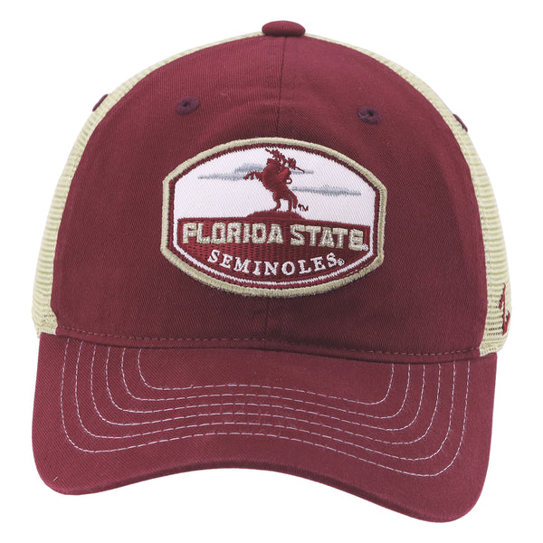 Material | 35% Cotton, 65% Polyester. Color | Garnet. Adjustable, low profile soft mesh trucker cap with embroidered Unconquered Silhouette Florida State Seminoles embroidered patch.