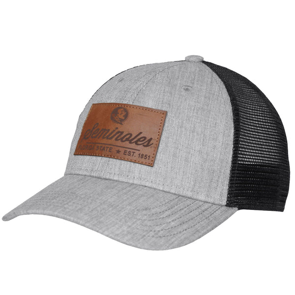 Material | 75% Polyester, 25% Rayon. Color | Heather Grey/Black. Adjustable, snapback low profile trucker cap with Seminole Head Seminoles patch.