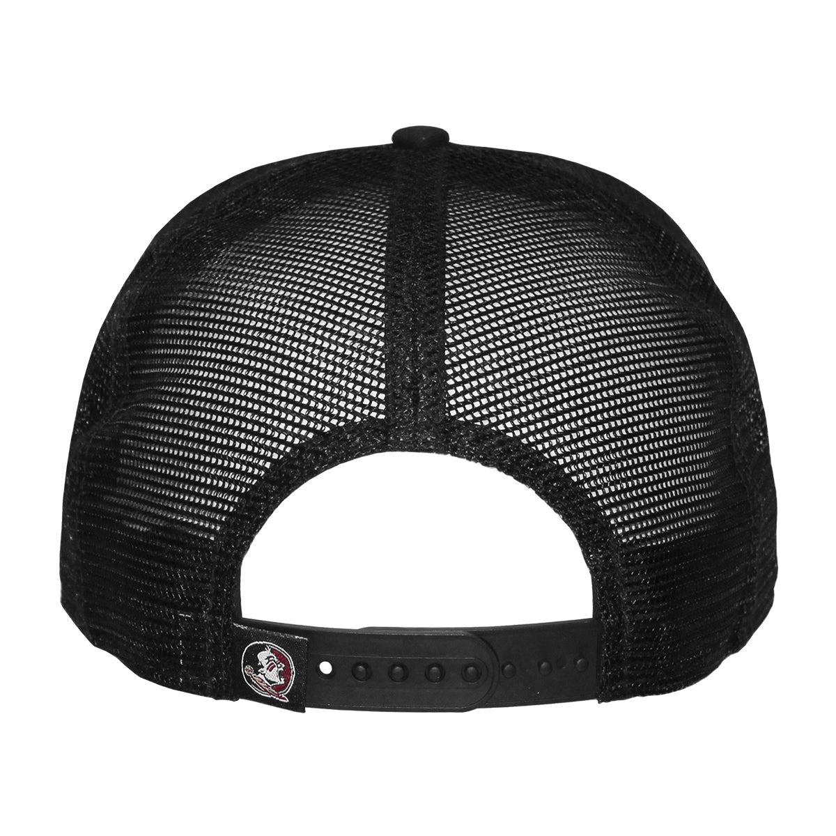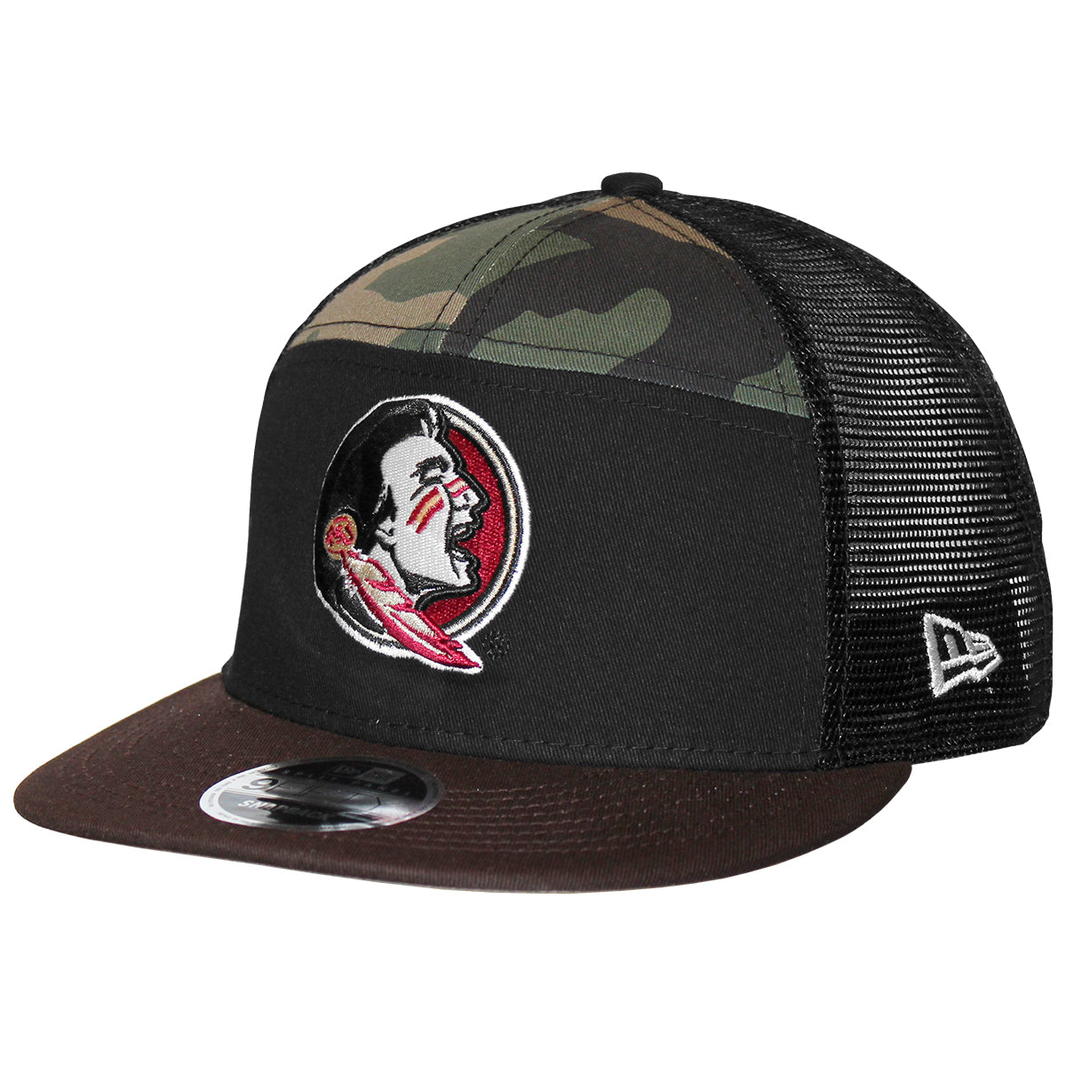 Material | 100% Polyester. Color | Camo/Black. New Era men's 950SP adjustable structured trucker hat with 3D embroidered Seminole Head. Embroidered Seminole Head woven label on back.