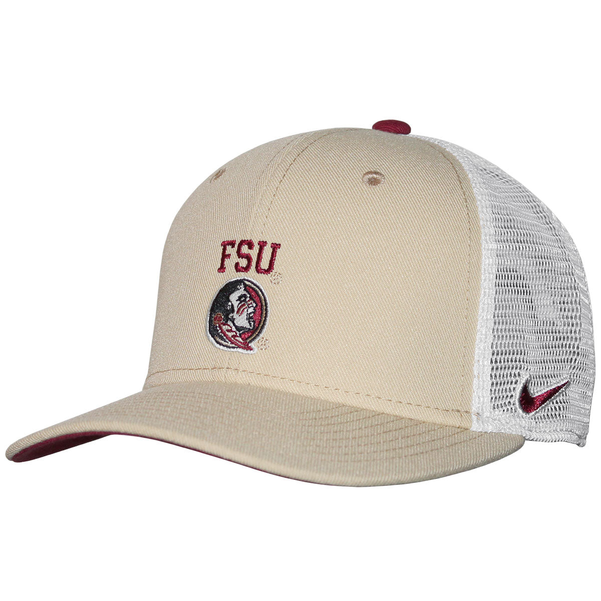 Material | 100% Polyester. Color | Vegas Gold/White. Nike youth adjustable structured trucker cap with embroidered FSU Seminole Head.