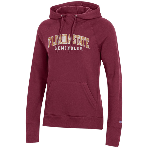Material | 60% Cotton, 40% Polyester. Color | Garnet. Champion women's hood with screen printed Florida State Seminoles. Pocket.