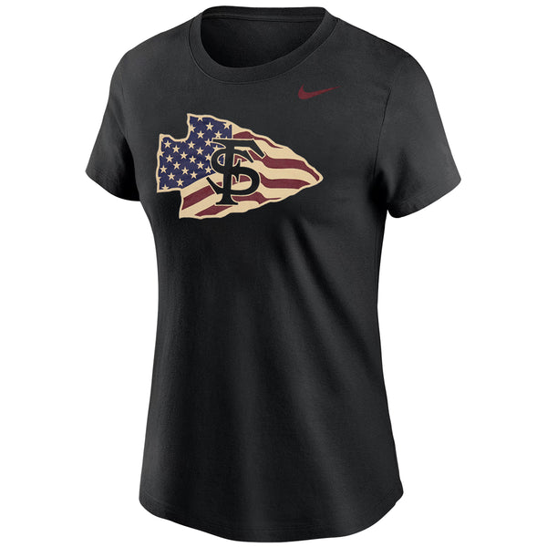 Material | 100% Cotton. Color | Black. Nike women's short sleeve t-shirt with screen printed Veteran's Alliance Arrowhead. The Veterans Alliance arrowhead is the proud symbol of Florida State University's campus-wide commitment to become a national beacon of veteran support and success. A portion of the proceeds from the sale of this merchandise supports veterans at FSU. For more information, please visit: veterans.fsu.edu.