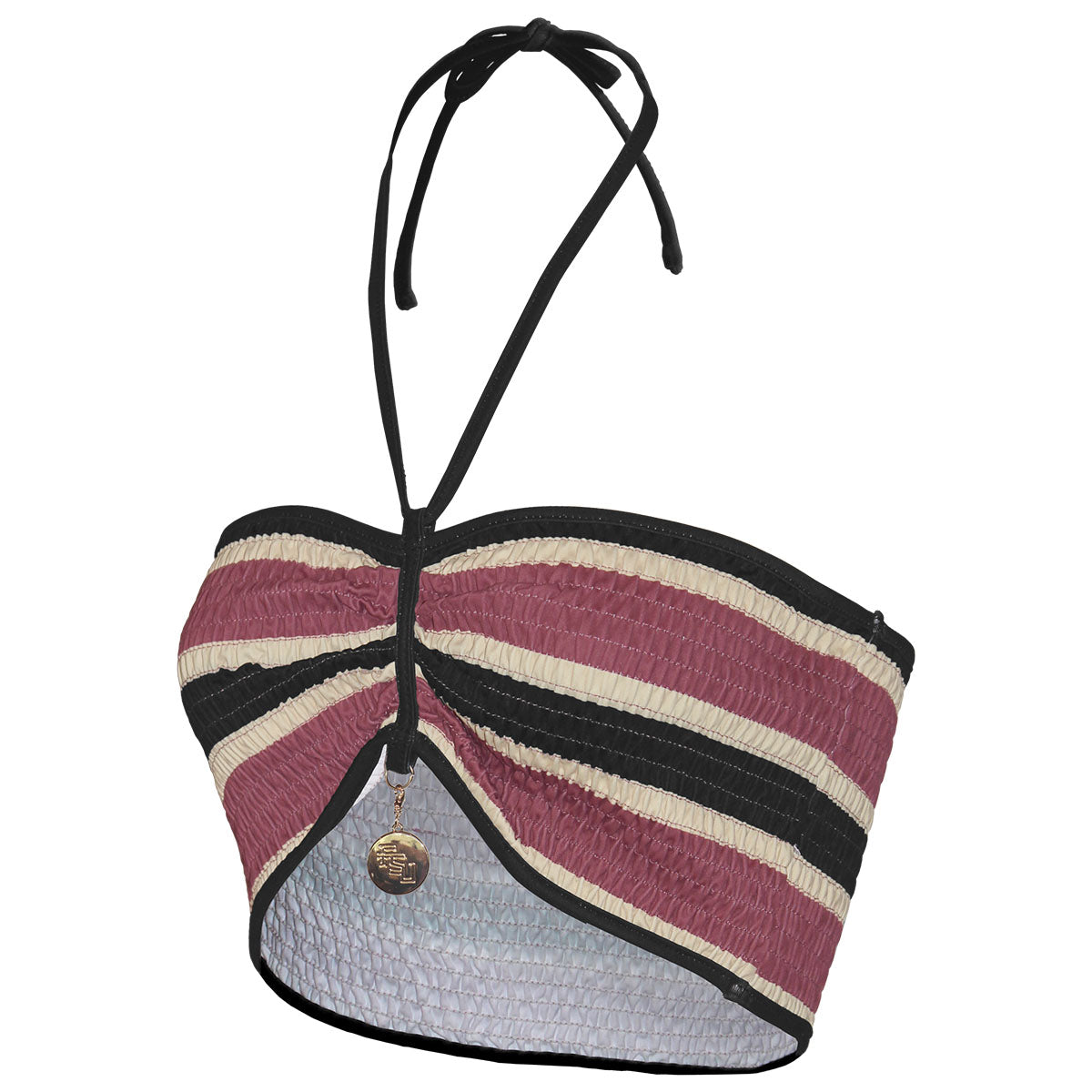 Material | 100% Polyester. Color | Garnet/Gold/Black. Women's strap striped bandeau top with Stacked FSU charm.
