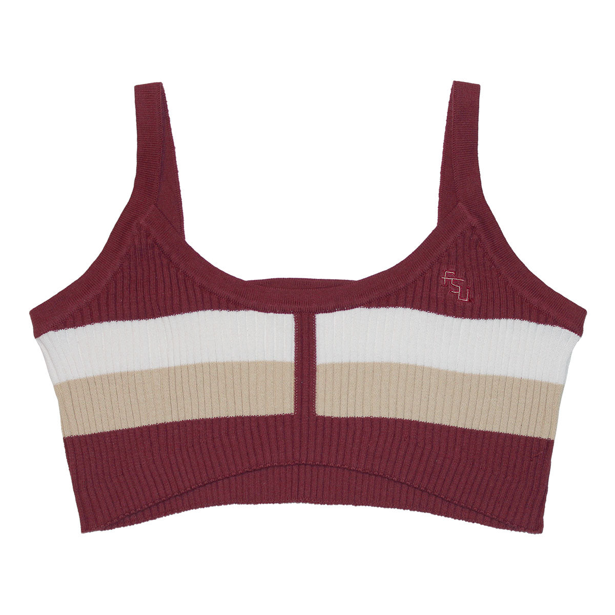 Material | 100% Cotton. Color | Garnet/Gold/White. Women's stripe knit bra with embroidered Stacked FSU.