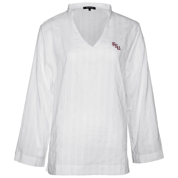 Material | 100% Linen. Color | White. Women's long sleeve woven top with embroidered Stacked FSU.