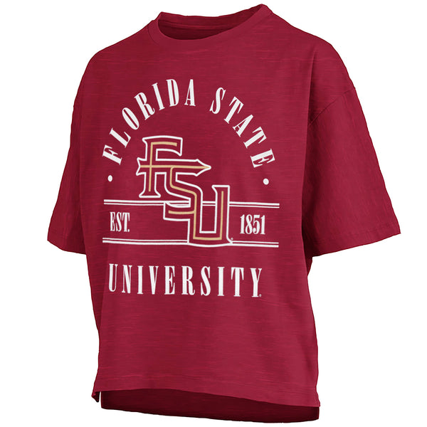 Pressbox Women's Florida State University/Stacked FSU Design Short Sleeve Waist-Length Oversized Slub Top - Garnet - Garnet / SM is backordered and will ship as soon as it is back in stock.