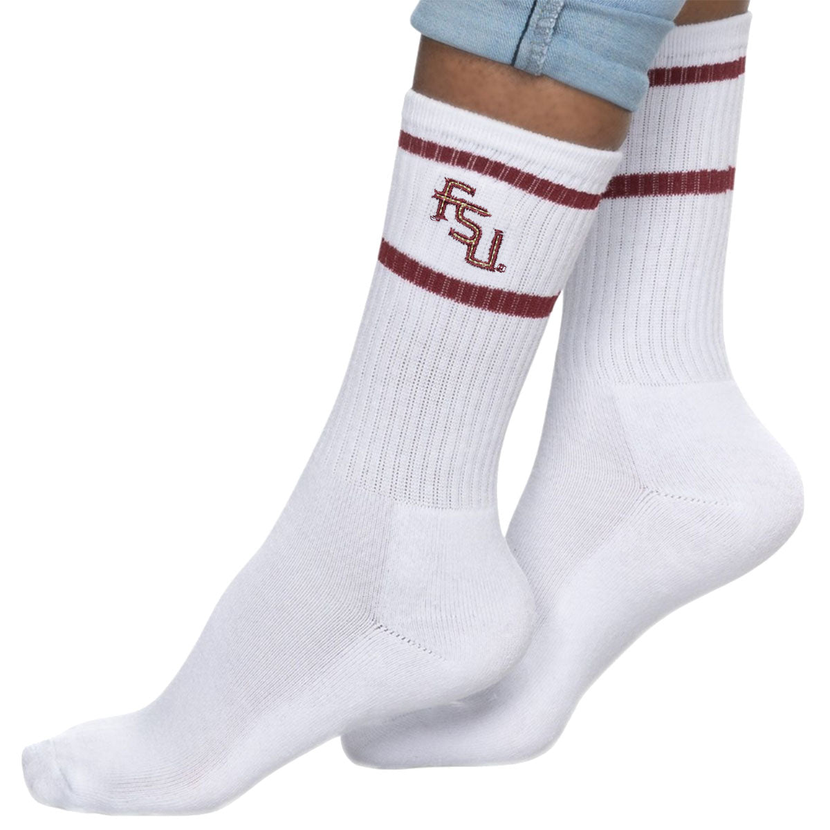 Material | 68% Cotton, 21% Polyester, 6% Nylon, 4% Rubber, 1% Spandex. Color | White. Women's stripe crew sock with embroidered Stacked FSU.
