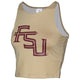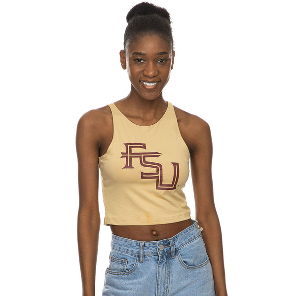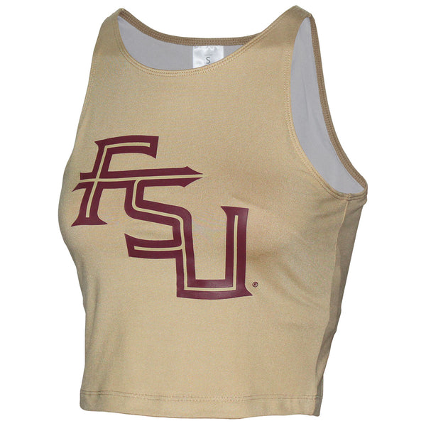 Material | 87% Polyester, 13% Spandex. Color | Gold. Women's sublimated crop top with Stacked FSU.