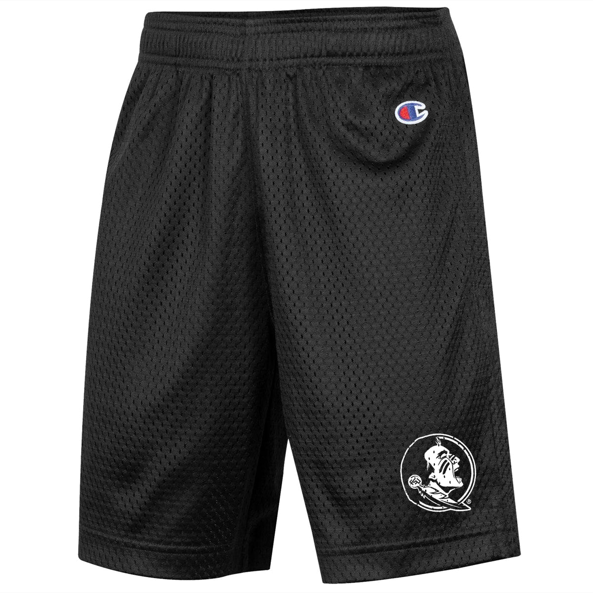 Material | 100% Polyester. Color | Black. Champion youth mesh shorts with screen printed Seminole Head. Pockets.