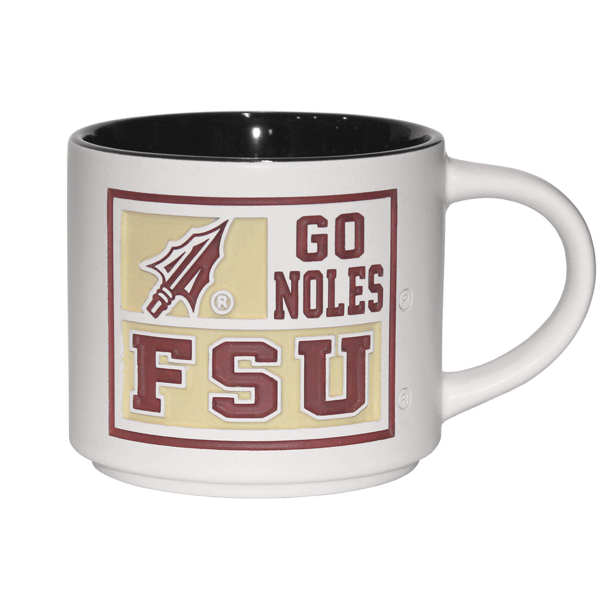 Material | 100% Ceramic. Color | White/Black. 15oz ceramic mug with engraved Arrowhead Go Noles FSU design.