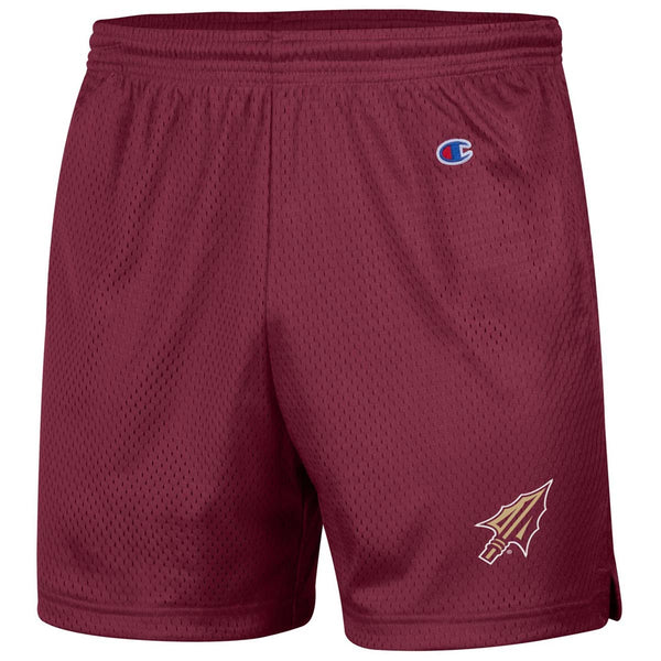 Material | 100% Polyester. Color | Garnet. Champion men's mesh short with screen printed Arrowhead. Drawstring. Pockets. 5" inseam.
