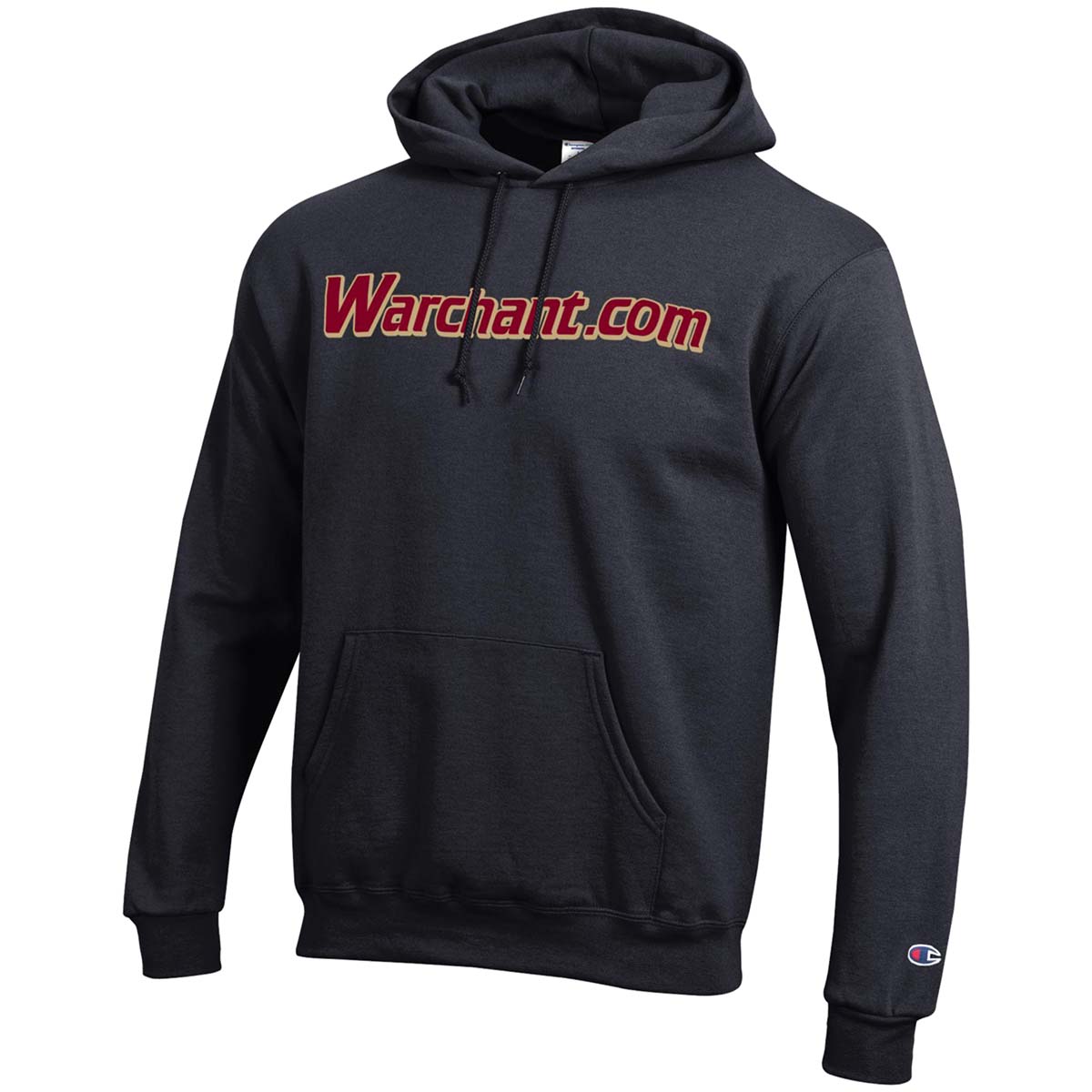 Material | 50% Cotton, 50% Polyester. Color | Black. Champion men's powerblend hood with screen printed Warchant.com.