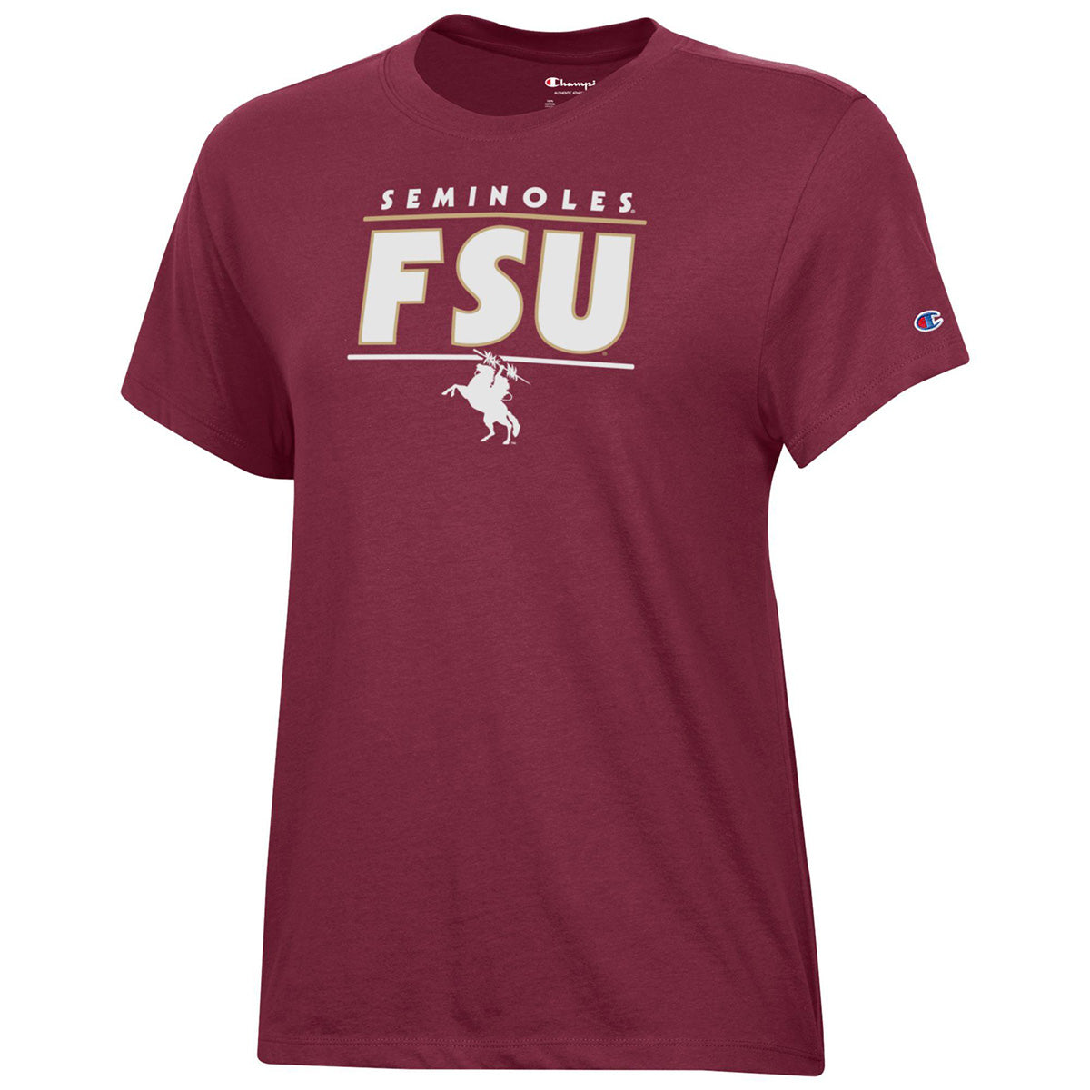 Material | 60% Cotton, 40% Polyester. Color | Garnet. Champion women's short sleeve t-shirt with screen printed Seminoles FSU Unconquered Silhouette.