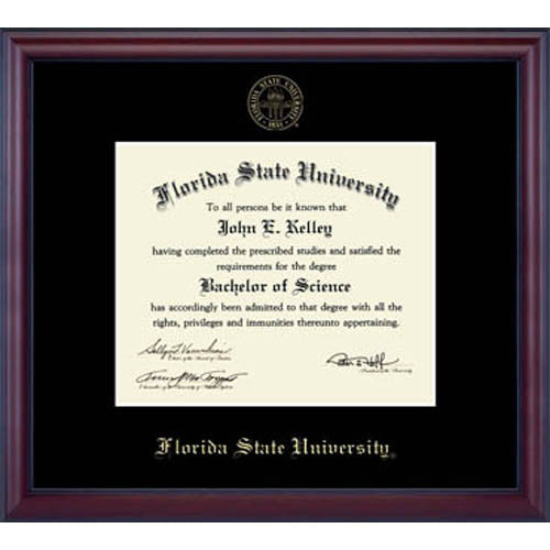 This Florida State diploma frame boasts museum-quality black matting with your Florida State logo and wordmarks ornately embossed in gold.