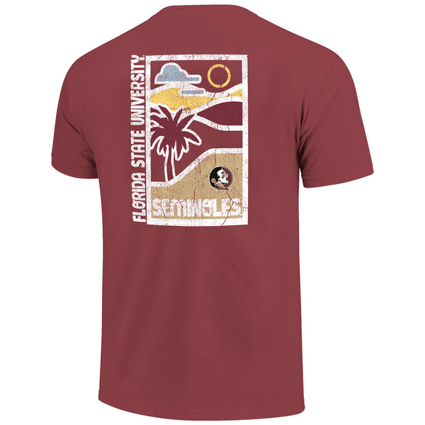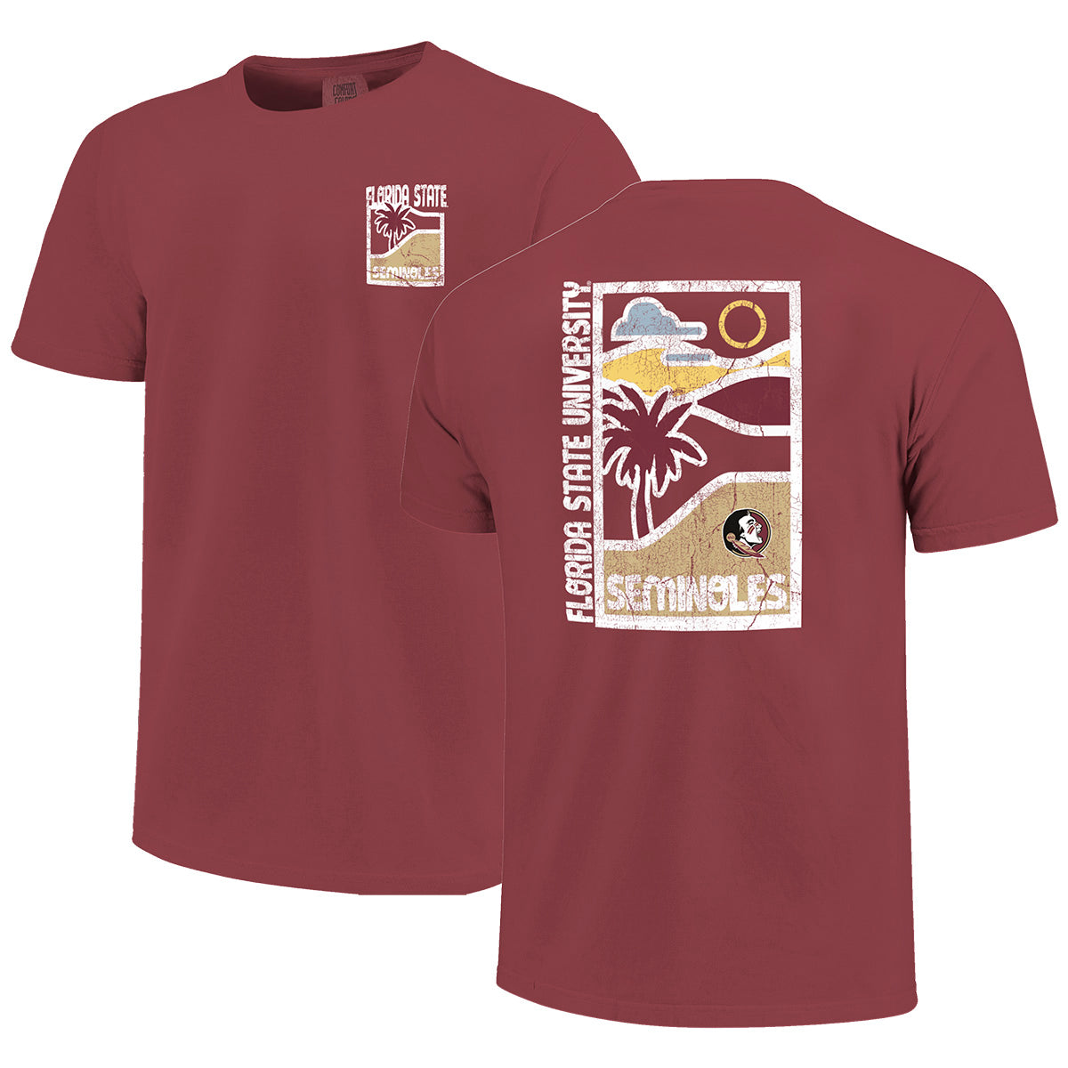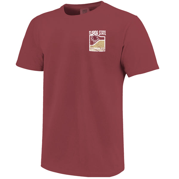 Material | 100% Cotton. Color | Brick. Comfort Colors short sleeve t-shirt with distressed screen printed Florida State Seminoles Palm tree front. Distressed screen printed Florida State Seminoles Seminole Head Palm tree design on back.