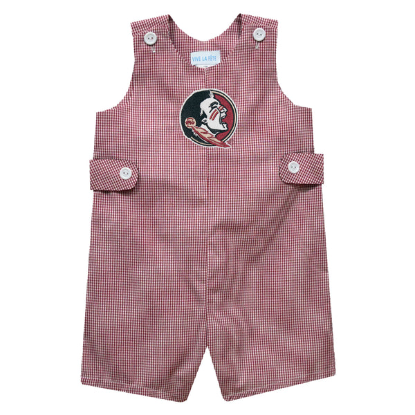 Material | 55% Cotton, 45% Polyester. Color | Garnet/White. Infant/Toddler boys mini check jon jon with embroidered Seminole Head.