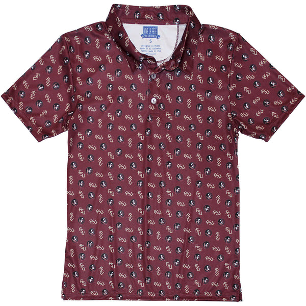 Material | 100% Polyester. Color | Garnet. Kids' sublimated polo with all over Stacked FSU/Seminole Heads.
