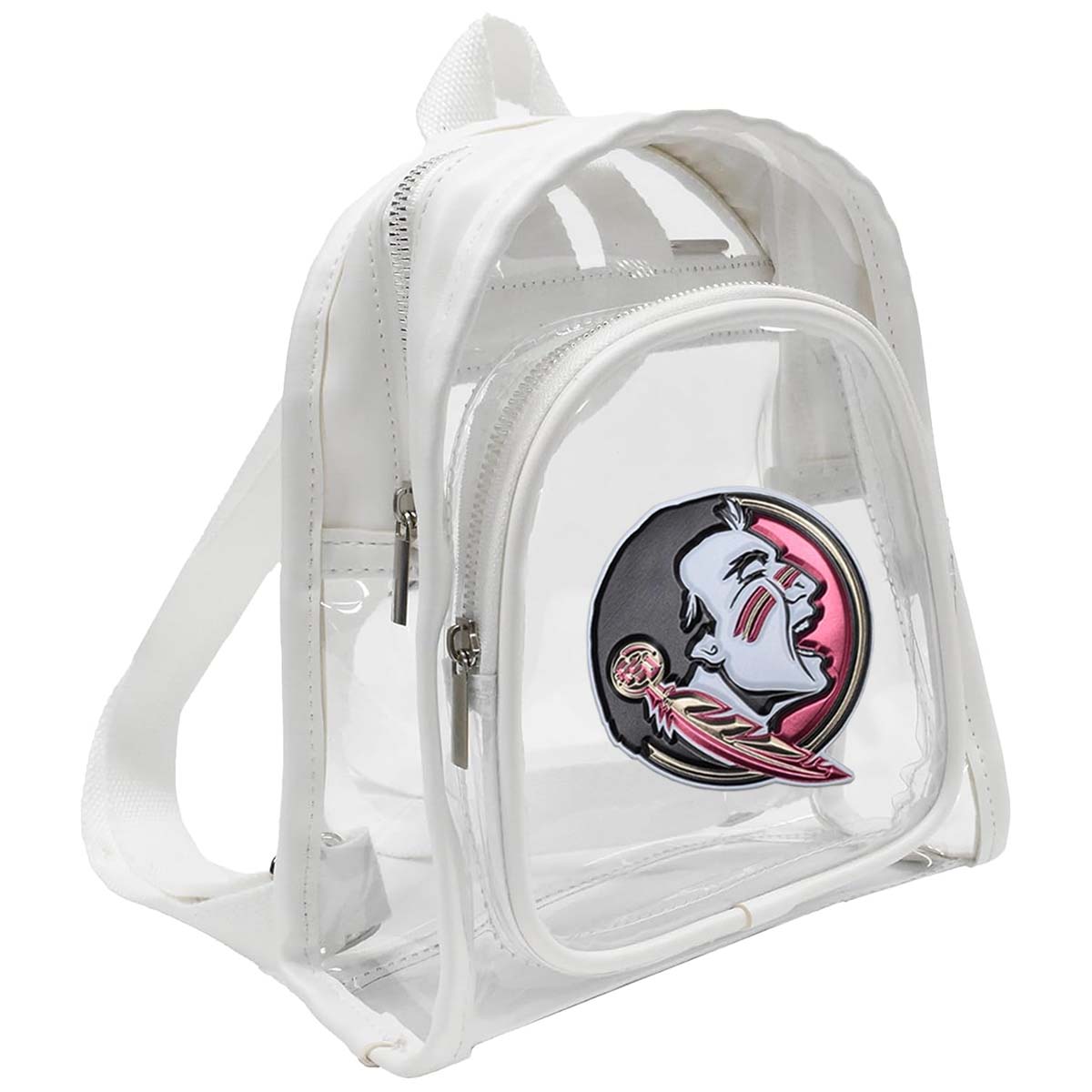 Clear mini backpack with 3D Seminole Head. Large main compartment. Small front compartment.