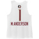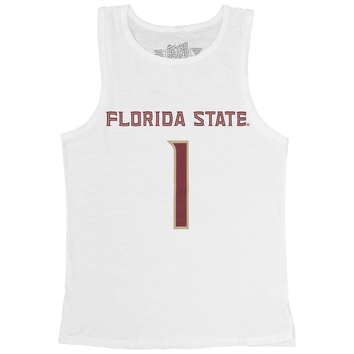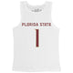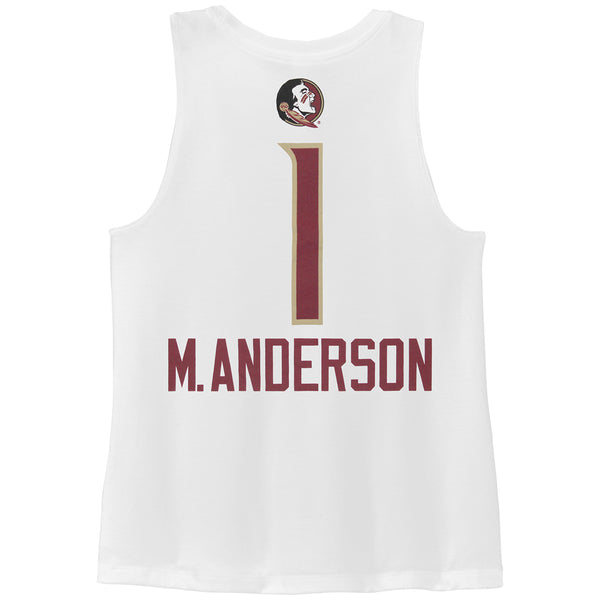 Material | 100% Cotton. Color | White. Women's tank with screen printed Florida State #1 M. Anderson.