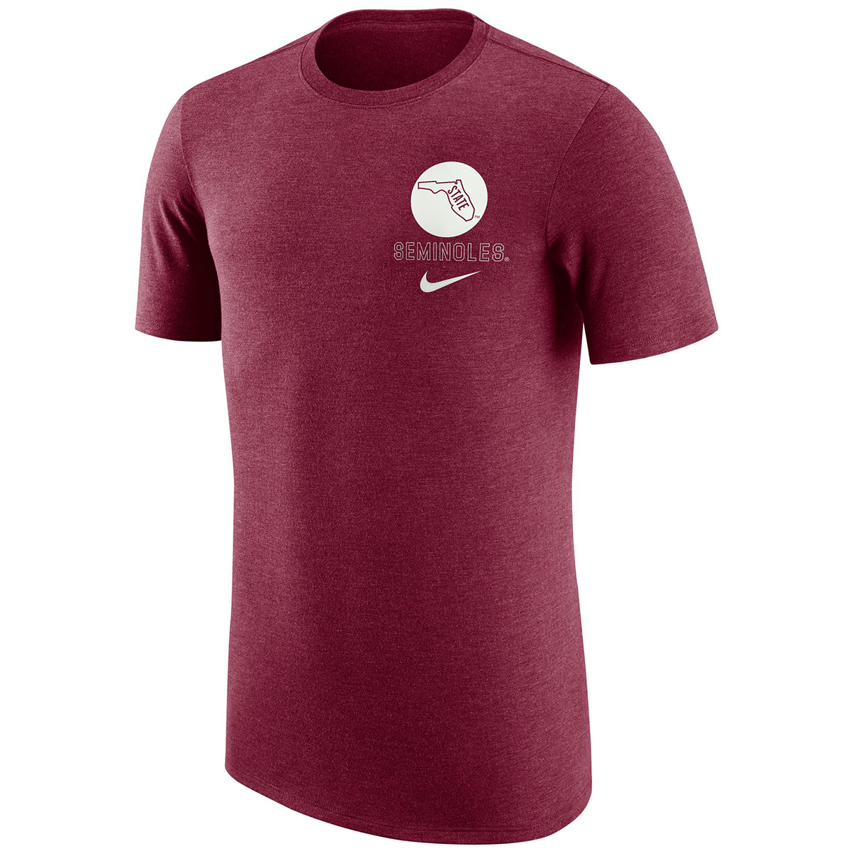 Material | 50% Polyester, 25% Cotton, 25% Rayon. Color | Garnet. Nike men's tri-blend short sleeve Retro t-shirt with screen printed Vault State of Florida Seminoles design.