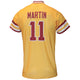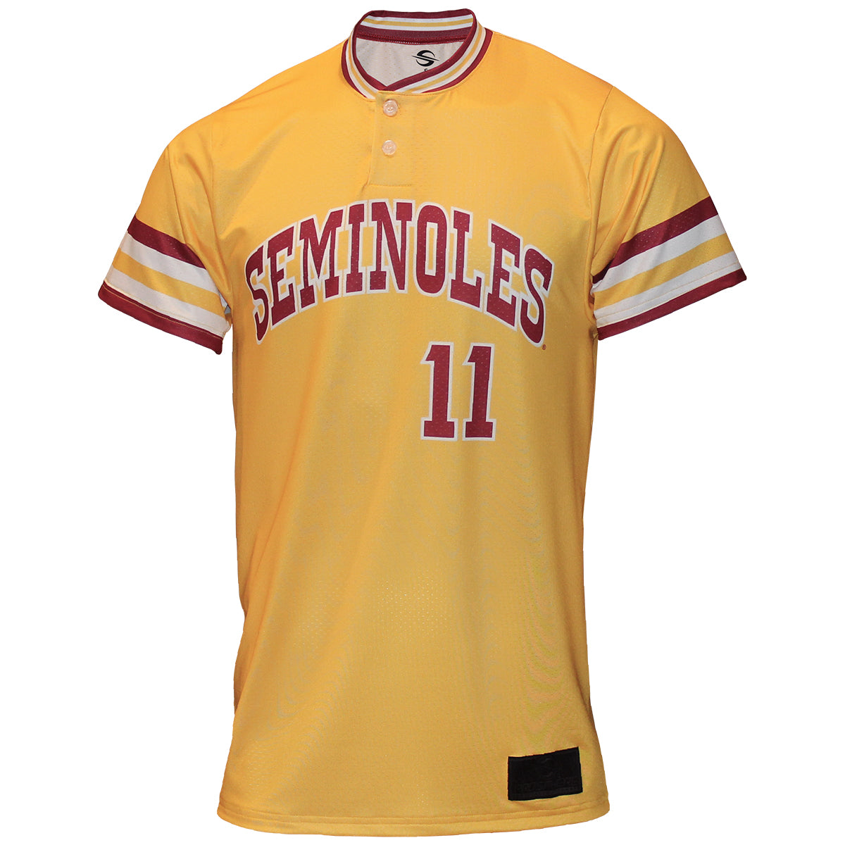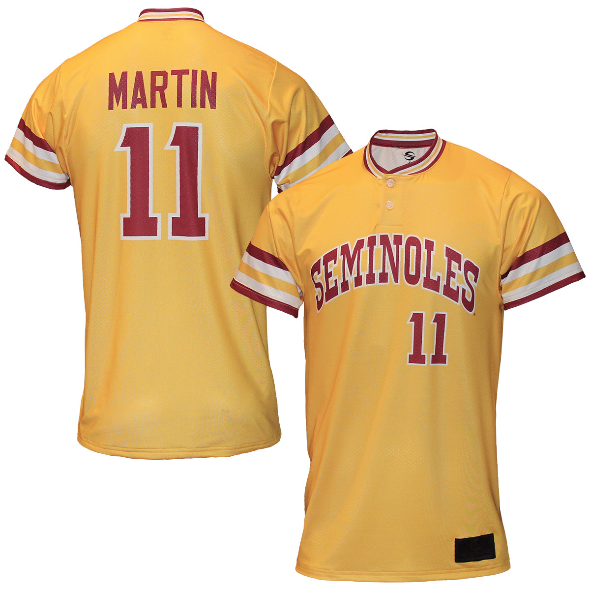 Material | 92% Polyester, 8% Lycra. Color | Gold. Men's Mike Martin sublimated Baseball jersey with Seminoles 11 on front, Martin 11 on back.