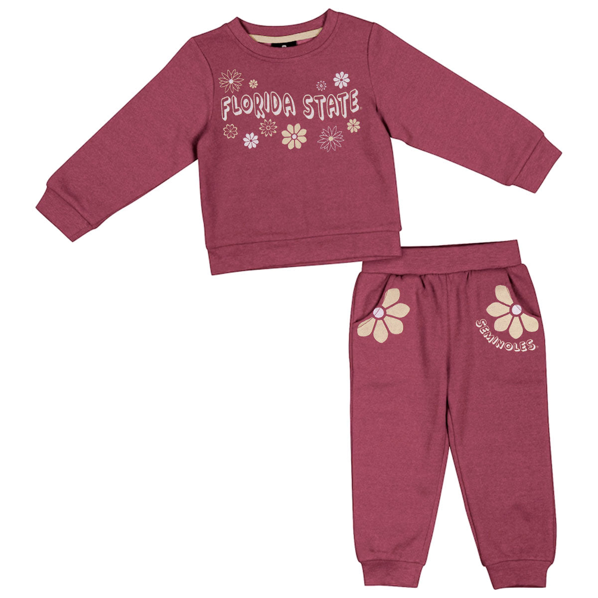Material | 55% Cotton, 45% Polyester. Color | Garnet. Toddler girl's crew fleece with screen printed Florida State flower design. Pant has screen printed Seminoles flower design and pockets.