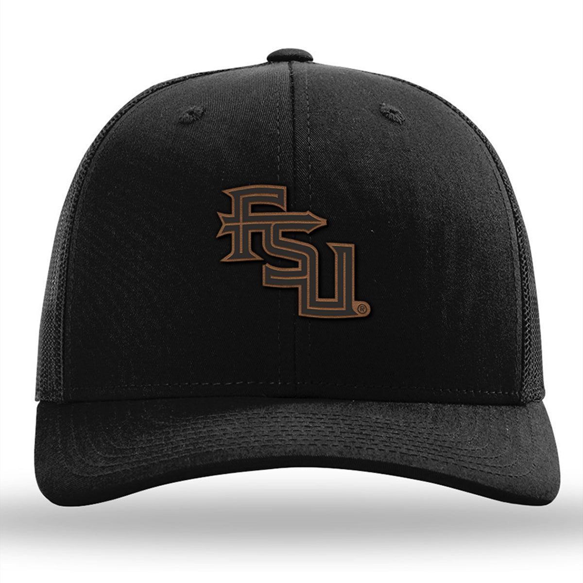 Material | 60% Cotton, 40% Polyester. Color | Black. Richardson 112 men's adjustable trucker cap with Stacked FSU Leather patch.