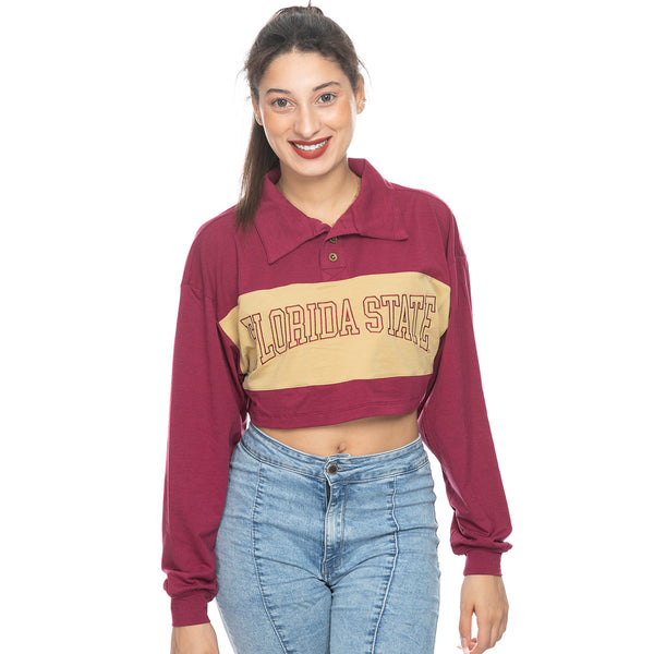 Material | 62% Polyester, 33% Rayon, 5% Spandex. Color | Garnet/Gold. Women's collared rugby crop long sleeve with embroidered Florida State.