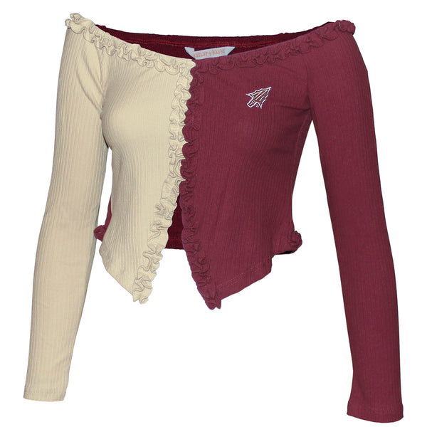 Material | 93% Polyester, 7% Spandex. Color | Garnet/Gold. Women's ribbed off the shoulder long sleeve crop top with embroidered Arrowhead.