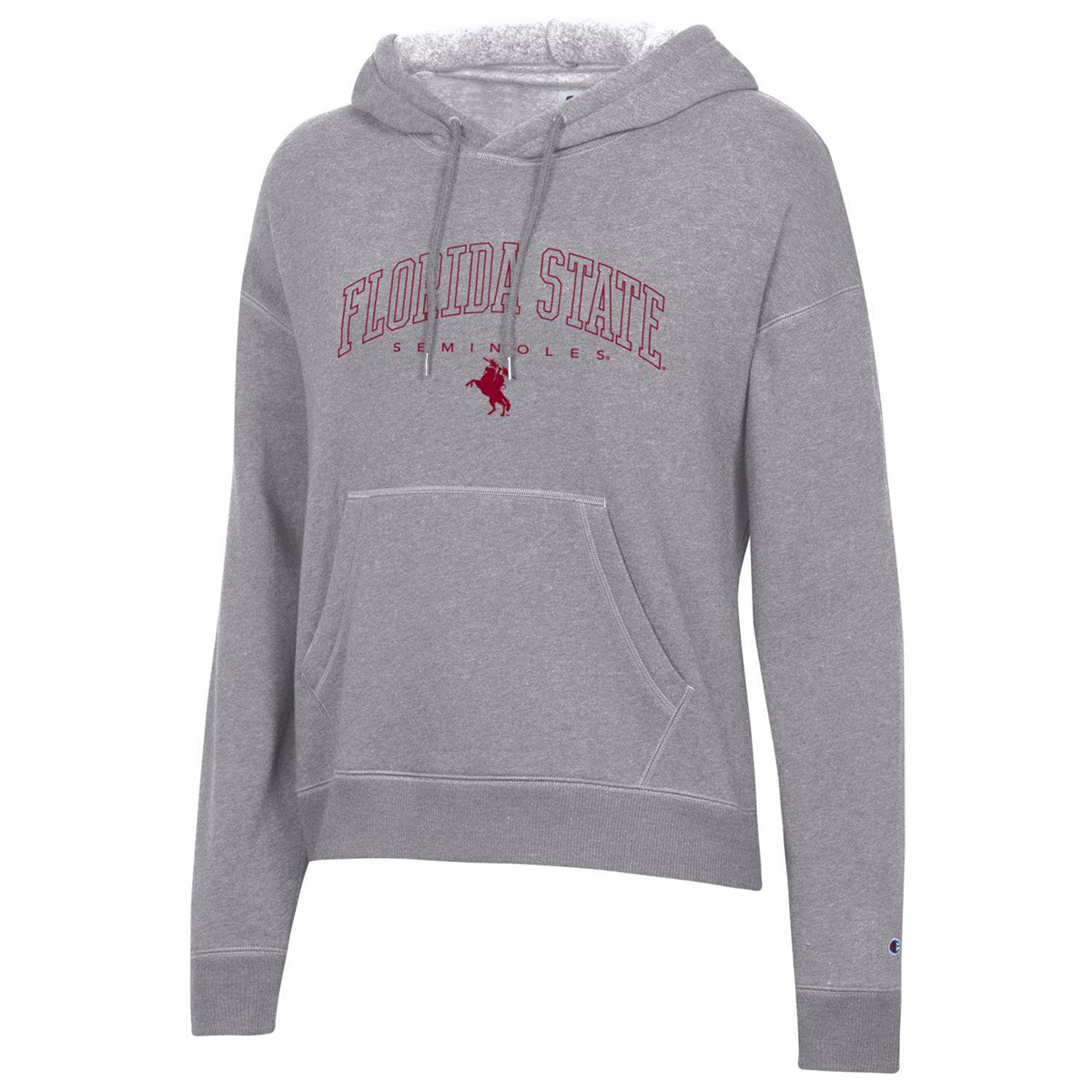 Material | 47% Polyester, 39% Cotton, 14% Rayon. Color | Grey. Champion women's tri-blend hood with screen printed Florida State Seminoles Unconquered Silhouette.